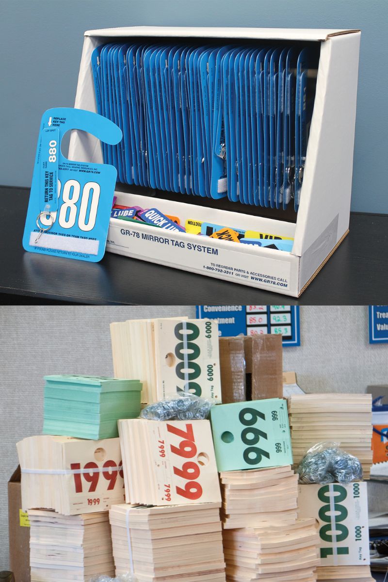 The GR-78 Mirror Tag System is a reusable mirror tag system that consists of a 5.5” x 8.75” durable Mirror Tag with large 3-digit numbering on both sides. Each tag includes a matching removable and reusable Key Tag that easily attaches to the customer’s keys. The Key Tags also have blank areas to write the customer’s name and lot location of the vehicle using a Sharpie, which can be wiped clean after each use with alcohol or brake cleaner.