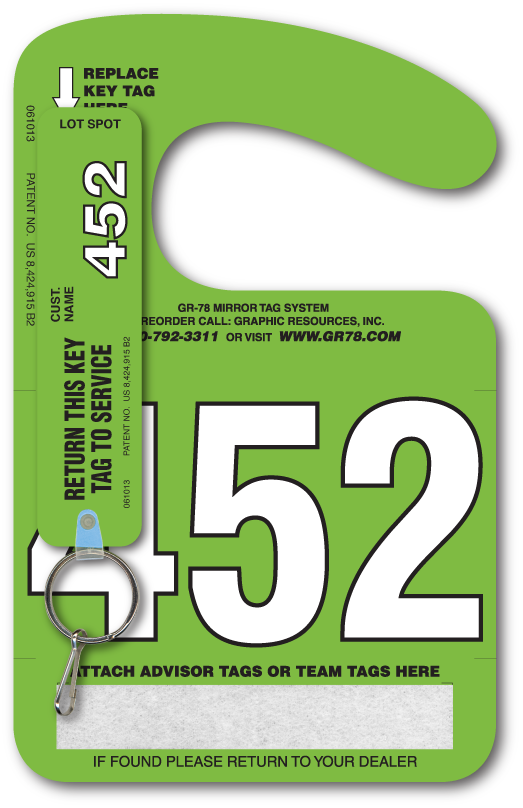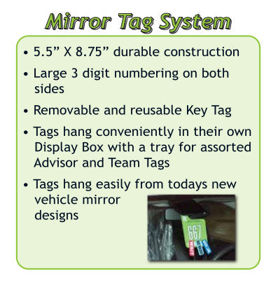 The Mirror Tag System is a reusable mirror tag system that consists of a 5.5” X 8.75” durable Mirror Tag with large 3 digit numbering on both sides. Each tag includes a matching removable and reusable Key Tag that easily attaches to the customers keys. The Key Tags also have blank areas to write the customers name and lot location of the vehicle using a Sharpie which can be wiped clean after each use with alcohol or brake cleaner.